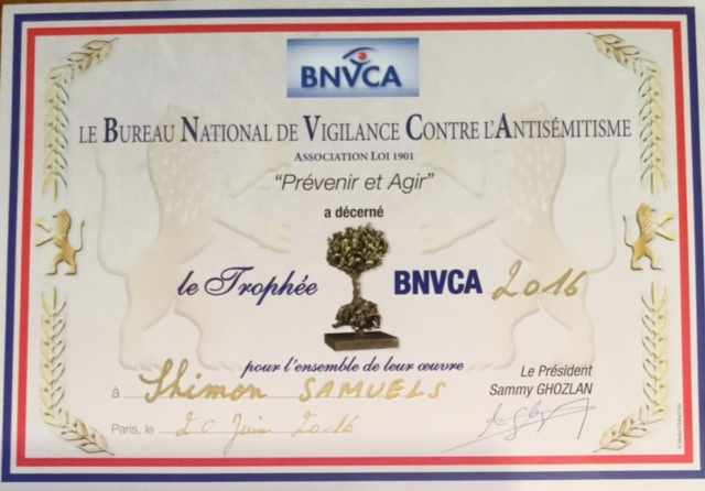 BNVCA President, Sammy Ghozlan and Centre Simon Wiesenthal - France President Richard Odier, honoured Samuels for "his role in the Bureau's establishment and his commitment to containing antisemitism in France and in the international arena".